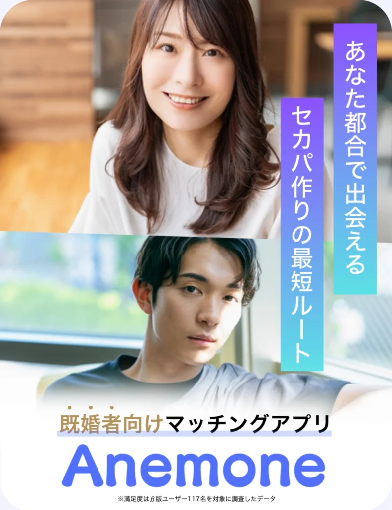Anemoneで知り合った彼女には、仕事の愚痴や家庭の悩みを素直に話せます。否定されることなく「頑張ってるね」と言ってもらえるだけで、心が軽くなりました。家庭を壊すつもりはないけれど、自分を取り戻せる時間ができたことで、以前より前向きに過ごせるようになりました。