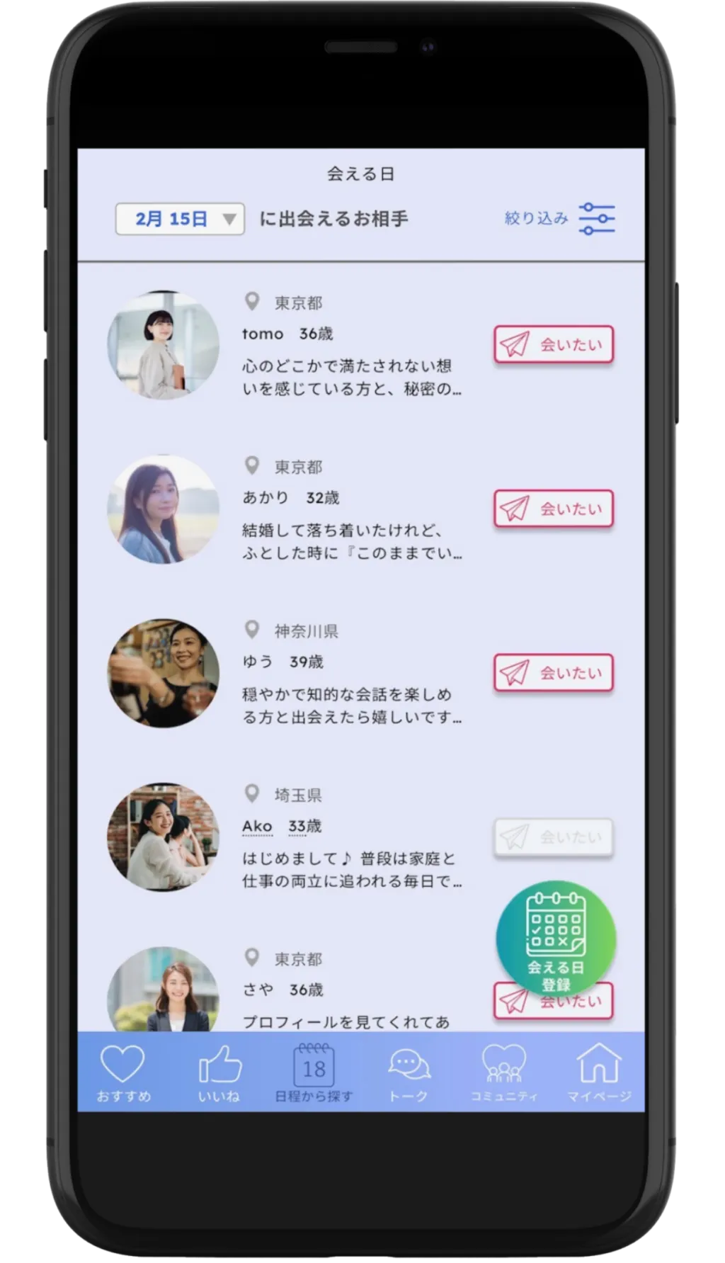 会いたい日にちでお相手を探し、気になる人に「会いたい」を送信。「会いたい」を受け取りたい人は事前に自分の予定を登録しておきましょう。互いに「会いたい」が成立すればマッチングとなり、あとはメッセージで時間や場所を決めるだけ。ライフスタイルに合わせたマッチングが可能です。